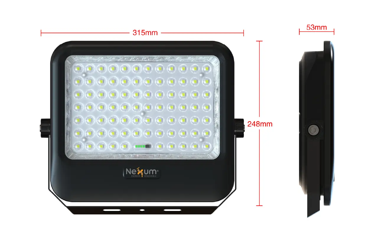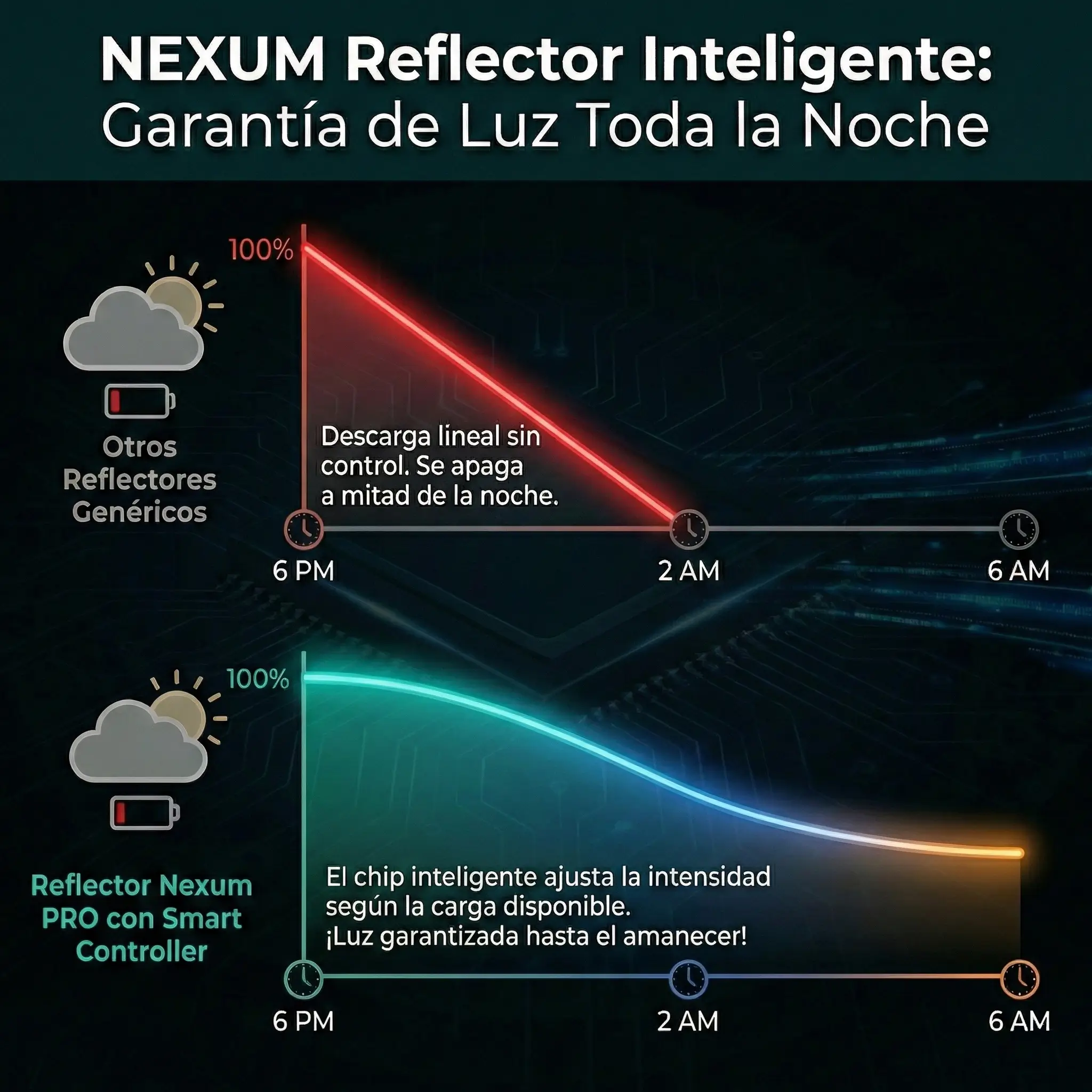 El Reflector Solar Inteligente de Nexum representa la evolución en iluminación autónoma. A diferencia de los reflectores genéricos que sufren de «descarga lineal» (brillan mucho al principio y se apagan a las 3 AM), este equipo incorpora un microprocesador Smart Controller que gestiona la batería milimétricamente.
